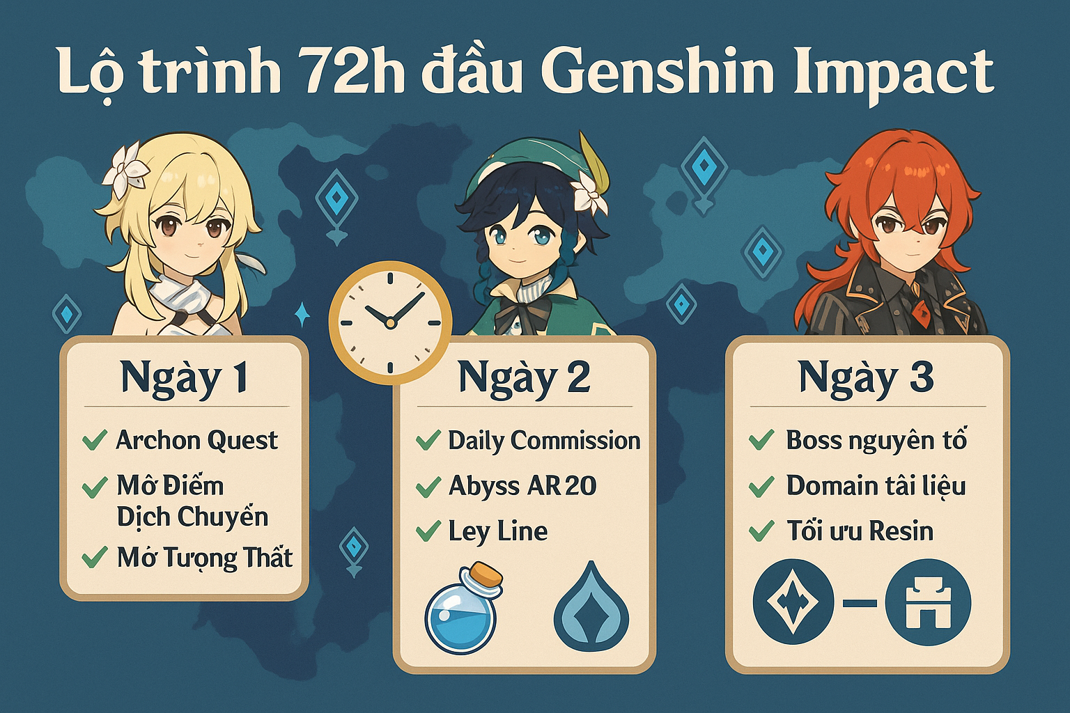 Lộ trình 72h Genshin rõ ràng: Ngày 1 cắm cờ & mở tính năng; Ngày 2 vào nhịp Daily + Abyss; Ngày 3 boss + domain theo lịch.